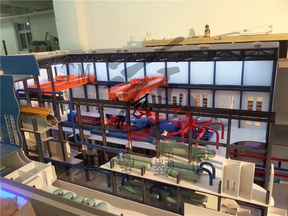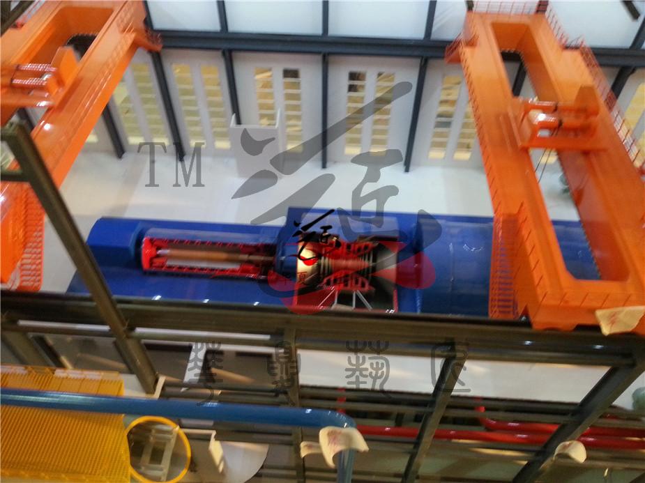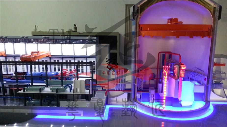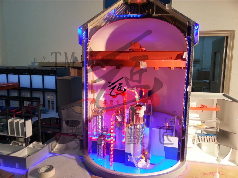 模型按照甲方提出的招標(biāo)要求、提供的AP1000圖紙和雙方約定的模型表現(xiàn)效果制作。主要表現(xiàn)核島和常規(guī)島兩部分,核島部分主要表現(xiàn)雙層安全殼體以及殼體內(nèi)部的主要設(shè)備。主要設(shè)備包括環(huán)吊、堆體、熱交換導(dǎo)管、堆芯、控制棒、蒸汽發(fā)生器及穩(wěn)壓器等設(shè)備。其中堆體、蒸汽發(fā)生器、壓力聯(lián)箱采用剖開(kāi)的形式表現(xiàn),能夠看到設(shè)備內(nèi)部結(jié)構(gòu),用LED漸進(jìn)動(dòng)態(tài)隱藏?zé)艄獗憩F(xiàn)各設(shè)備的工作流程原理,一回路管道布局采用不同顏色的LED燈光表現(xiàn);常規(guī)島部分主要體現(xiàn)出蒸汽輪機(jī)、冷凝器、發(fā)電機(jī)、除氧器、汽水分離器、天吊等設(shè)備。其中蒸汽輪機(jī)采用用半剖形式體現(xiàn)輪機(jī)葉片和轉(zhuǎn)動(dòng),模擬發(fā)電過(guò)程。二回路采用不同的LED燈光表現(xiàn)熱蒸汽和冷凝水的管道及流向;模型嚴(yán)格按圖紙微縮仿真制作,體現(xiàn)出設(shè)備和管道的真實(shí)金屬質(zhì)感。采用自主研發(fā)的漸進(jìn)燈光技術(shù)利用不同顏色表現(xiàn)回路管線蒸汽流動(dòng)和溫差變化,罐體內(nèi)部安裝變化燈光體現(xiàn)汽、水的不同介質(zhì),通過(guò)各種燈光和動(dòng)態(tài)表現(xiàn)出整個(gè)核電的啟動(dòng)、停堆、非能動(dòng)堆芯冷卻系統(tǒng)動(dòng)作以及非能動(dòng)安全殼冷卻系統(tǒng)事故運(yùn)行的工藝流程,為了逼真展示非能動(dòng)效果,安全殼上部水箱采用動(dòng)態(tài)燈光和堆芯內(nèi)部采用動(dòng)態(tài)藍(lán)色燈光表現(xiàn)水淹沒(méi)堆芯效果。體現(xiàn)出氫爆的解決方案:反映出非安全相關(guān)的縱深防御系統(tǒng),用點(diǎn)式燈光表現(xiàn)出氫氣檢測(cè)器位置和點(diǎn)火器的位置。為了便于堆芯剖面能面向觀眾更清楚的了解,采用殼體內(nèi)部整體旋轉(zhuǎn)60度角度,模型采用按鍵或遙控的控制方式。