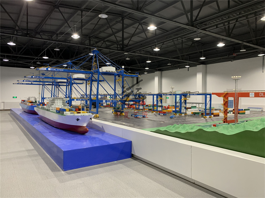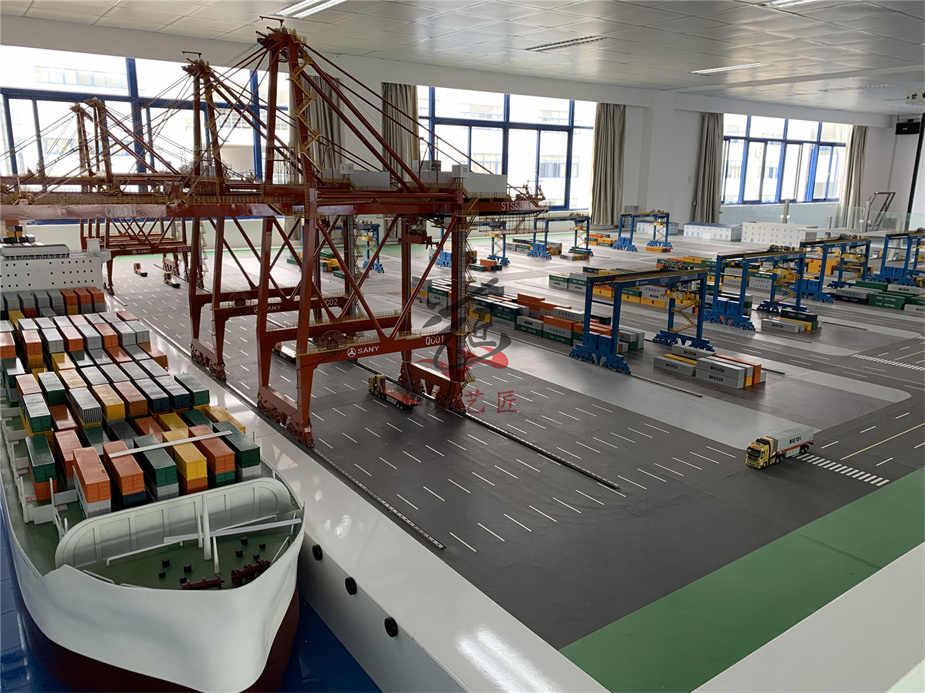 港口物流動態(tài)沙盤整體設(shè)計。該模型主要體現(xiàn)框架結(jié)構(gòu)體系,即模型需要很直觀的反映結(jié)構(gòu)的板.梁.柱.基礎(chǔ)的關(guān)系,同時還需要反映圍護結(jié)構(gòu)埴充墻、門窗等與結(jié)構(gòu)的聯(lián)系關(guān)系, 因此,模型設(shè)計時,我們采用在框架結(jié)構(gòu).上局部位置安裝填充堵,選一個方向的基礎(chǔ)裸露,將不同的構(gòu)件用不同的顏色區(qū)分,樓板采用灰色,梁柱基礎(chǔ)采用紅色,填充墻采用白色,門窗采用藍(lán)色。