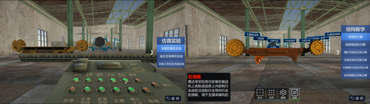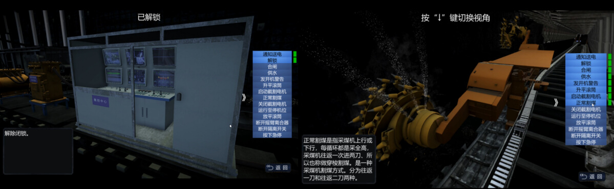 礦山工藝虛擬仿真系統(tǒng)實現(xiàn)了最大程度的模擬真實的設備及場景,包括采煤機、刮板運輸機、液壓支架、橋式轉載機、膠帶運輸機、泵站等設備和真實還原的綜采工作面場景,師生基于該系統(tǒng)可進行采煤機和液壓支架的的仿真訓練,包括:開停機操作、割煤工藝學習等。