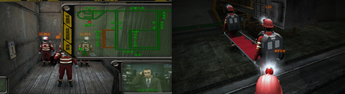 系統(tǒng)通過角色扮演的方式,讓實驗學生分別以現(xiàn)場工作人員或礦山救護隊員的身份進入虛擬場景,針對煤礦井下發(fā)生火災后正確的的觸警與判斷、現(xiàn)場自救與互救、現(xiàn)場滅火措施、安全撤離路線,以及礦山救護隊的接警與通知、判斷與決策、現(xiàn)場施救措施、救援行進路線等內(nèi)容進行身臨其境的訓練。
