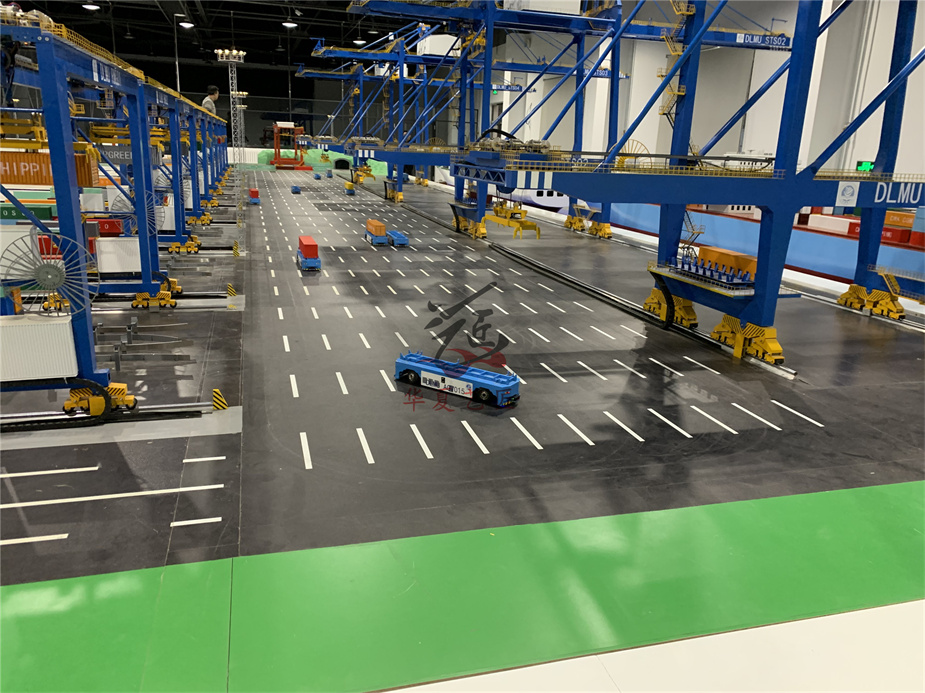 物流實驗?zāi)P推脚_(沙盤)總體制作面積為6×4=24平方米,總高度為1.3米,布局更能使學(xué)生能夠看清每一區(qū)域的結(jié)構(gòu)布置及其相互關(guān)系,更便于控制此模型的仿真動態(tài)演示。模型以沿海集裝箱碼頭的港口碼頭運輸區(qū),配備以公路運輸區(qū),鐵路運輸區(qū),空港運輸區(qū),配送中心以及相關(guān)服務(wù)功能區(qū)統(tǒng)組成一個直觀的沿海大型物流樞紐中心整體沙盤模型。
