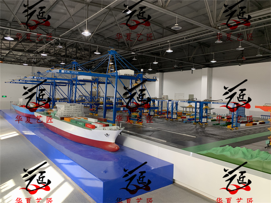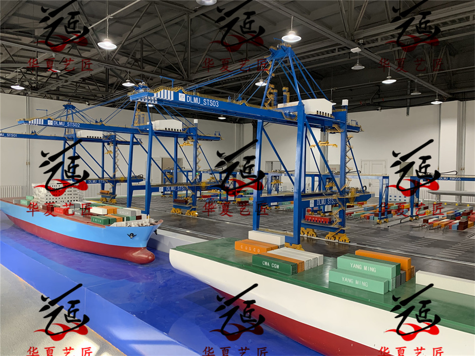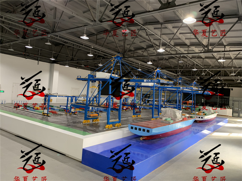利用碼頭縮尺沙盤形式,展示港口整體布局及碼頭作業(yè)流程,設(shè)置互動按鈕可一鍵啟動碼頭運作流程的演示。沙盤中涉及的展品如下: